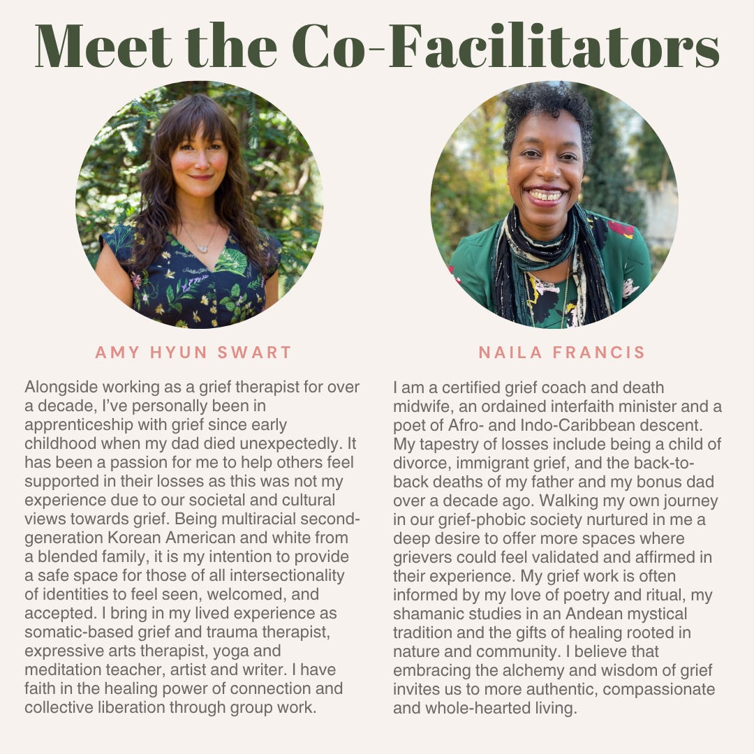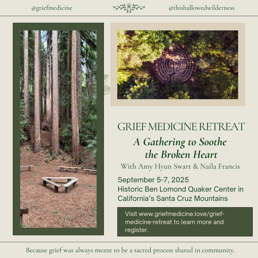 I'm also excited to extend an invitation to join me and grief therapist Amy Hyun Swart for a three-day grief retreat surrounded by the redwoods in the beautiful Santa Cruz Mountains in California.